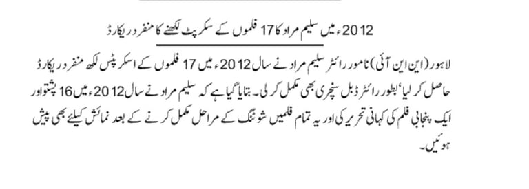 In Same Year 2012, veteran scriptwriter Saleem Murad set an extraordinary benchmark in the Pakistani film industry by writing 17 film scripts in a single year. His prolific output included 16 Pashto films and 1 Punjabi film, showcasing his versatility and deep understanding of regional cinema.